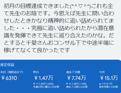 Makoto先生のアドバイスを忠実に守ってブログ記事を書けば必ず稼げるとわかりました。まだ2か月ですが、初月よりテクニックをあげた手ごたえがあり、収益(日給)の中央値は高くなっています。「月収100万まで導く」が先生の口癖ですが、他のコンサル生さんがそうだったように、私も必ずそこに到達できるだろうという自信もついてきました。
