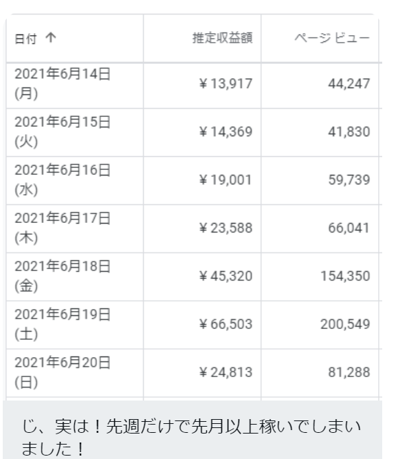 そして、翌月には「週給20万円」も達成し、アドセンス報酬だけで月収100万円が射程に入っていきました!